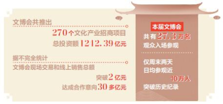 突出项目带动,文化交易持续增强。本届文博会充分发挥展会在产业交流、项目合作、招商推介等方面的平台作用,将洽谈交易与文化博览相互融合,吸引了省内外文化产业界的广泛关注和参与,体现了我省文化产业的良好发展态势,也展示了文博会这一交流贸易平台释放的巨大能量。文博会共推出270个文化产业招商项目,总投资额1242.39亿元。据不完全统计,文博会现场交易和线上销售总额突破2亿元,达成合作意向30多亿元。