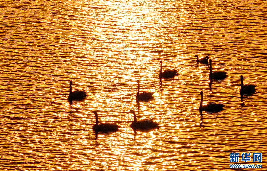 夕阳下,一群天鹅在新绛县汾河生态公园内觅食游玩。新华网 发(高新生 摄)