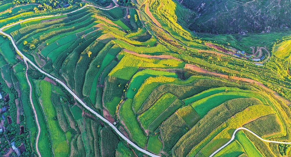 8月22日,夏县南大里乡,梯田秋禾、蜿蜒道路、山村民居、沟壑树木等相互映衬,构成一幅生机盎然的绿色生态画卷。(张秀峰摄)