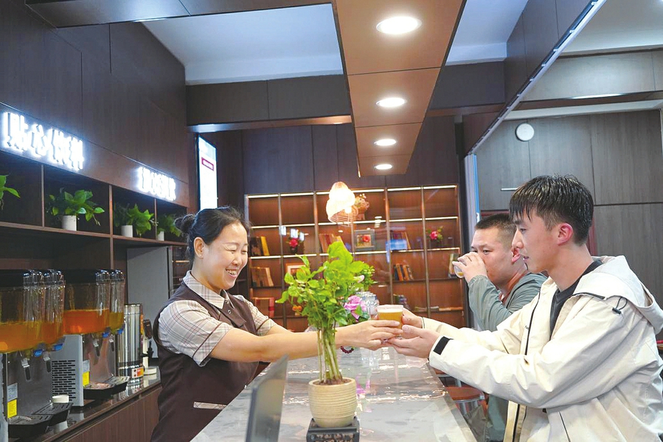 “给我拿杯咖啡。”刚上井的矿工赵师傅坐在吧台前,接过咖啡,脸上满是笑意。“过去下井前能喝上口热水就已经很满足了,如今在通勤路上就能领到免费饮品,累了还能在驿站里坐一坐。”