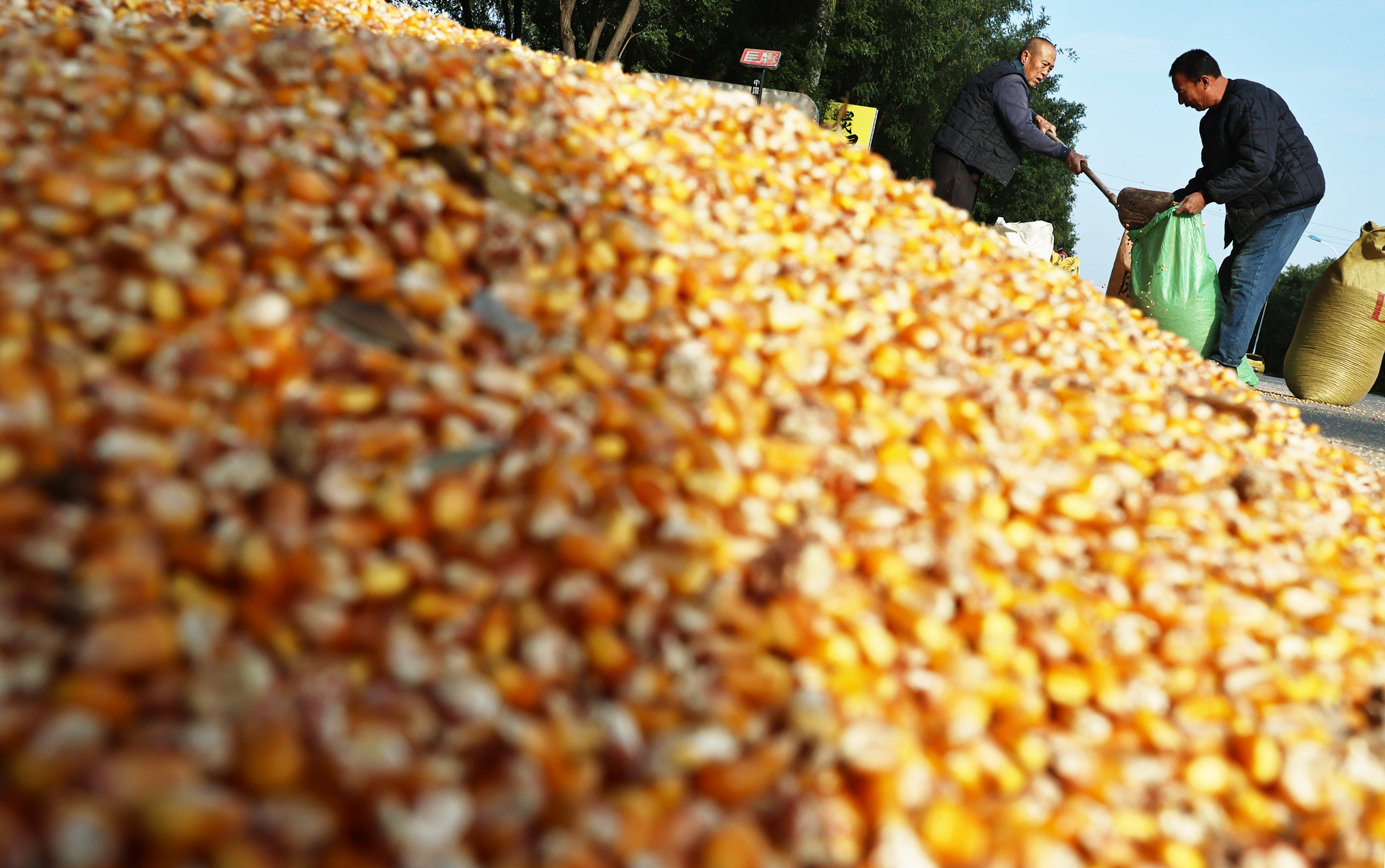 在新绛县龙兴镇西关村,村民将晾晒好的玉米装袋销售给粮食经纪人。