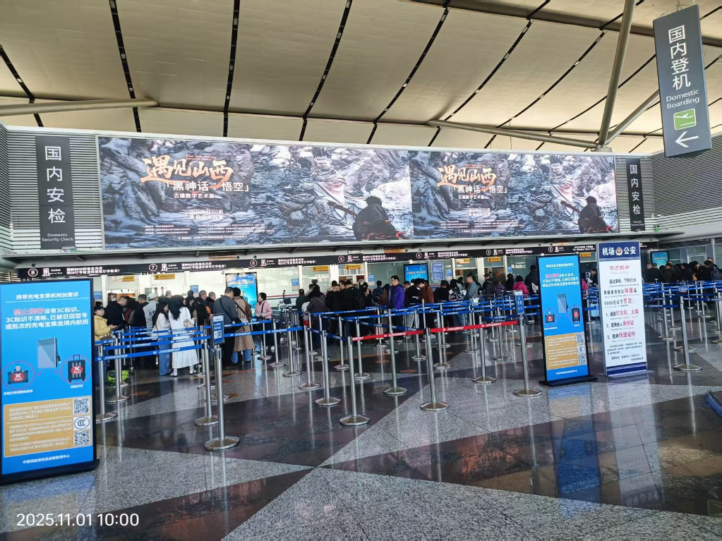 太原武宿机场大屏宣传「黑神话:悟空」遇见山西——古建数字艺术展。新华网 发