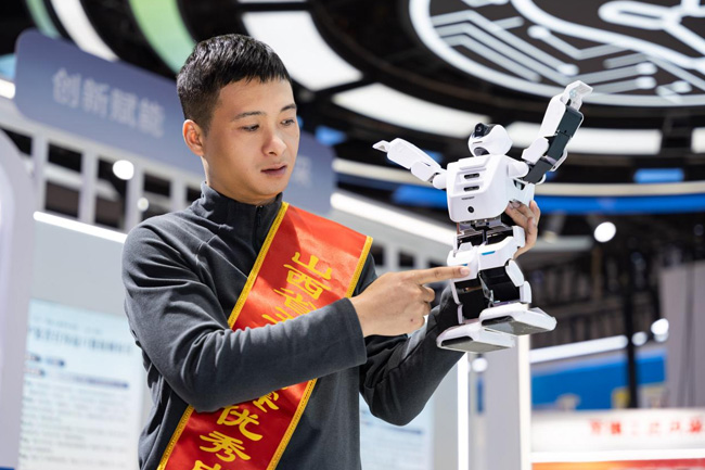 运城工匠学院工作人员向记者展示智能人型机器人。