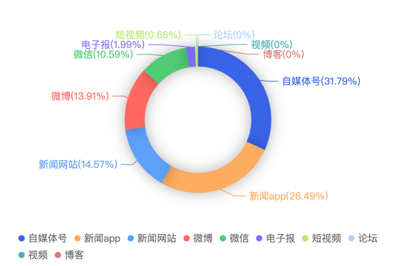 截至目前,该文章在互联网上传播总量共98篇。各信源的信息发布情况中,微博和新闻APP占比最大,其次是自媒体号。(数据来源:新华睿思·数媒智慧分析平台)
