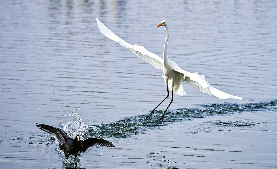 11月27日,太原汾河湿地公园,成群的白鹭、白骨顶鸡和凤头鸊鷉在水中游弋,时而追逐嬉戏,时而争抢食物,为冬日景区增添了勃勃生机。