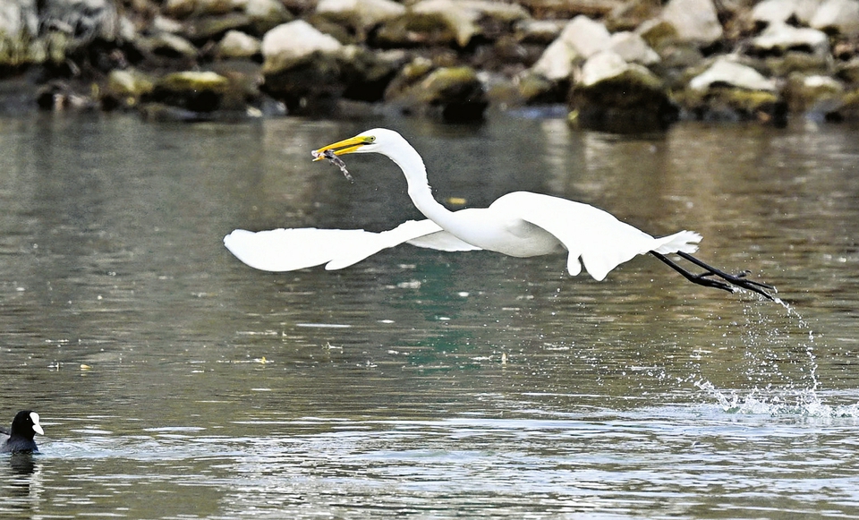 白鹭嘴里叼着捕到的鱼腾空而起。