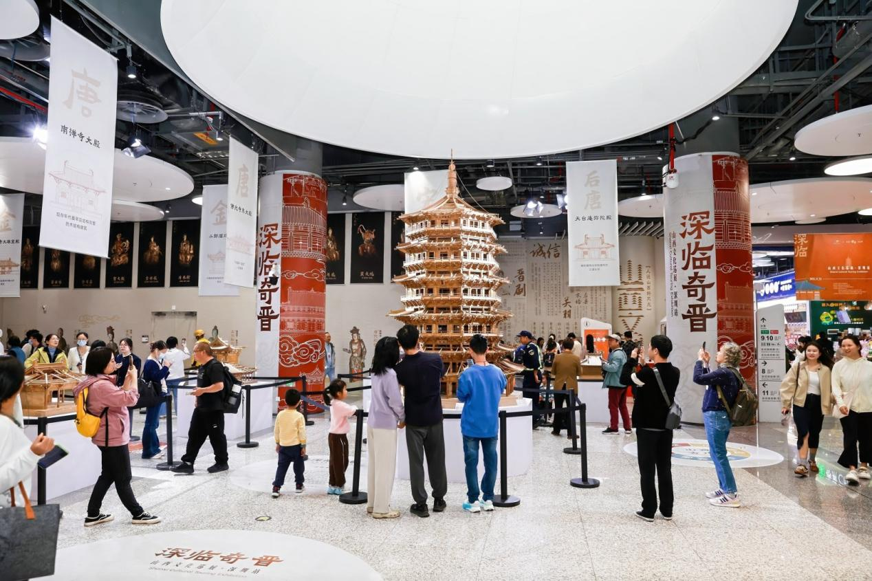 活动展区位于深圳之眼购物中心南区,以放射状布局构建沉浸式观展动线,依次展示山西古建、山西壁画、山西彩塑、山西非遗四大主题内容,包括3.3米高的应县木塔模型、整墙永乐宫《朝元图》及开化寺壁画落地条幅、玉皇庙二十八星宿彩塑复制品等重磅展品。这种开放式的展陈、零距离的沉浸式体验,生动再现了山西地上文物的风姿,吸引人们驻足停留。