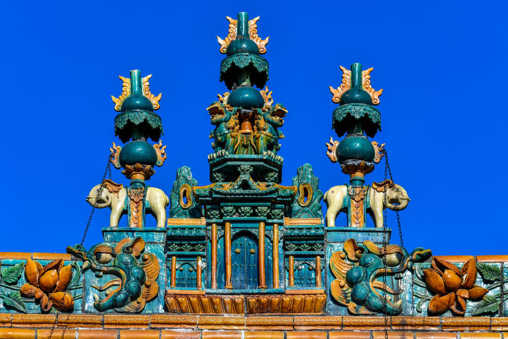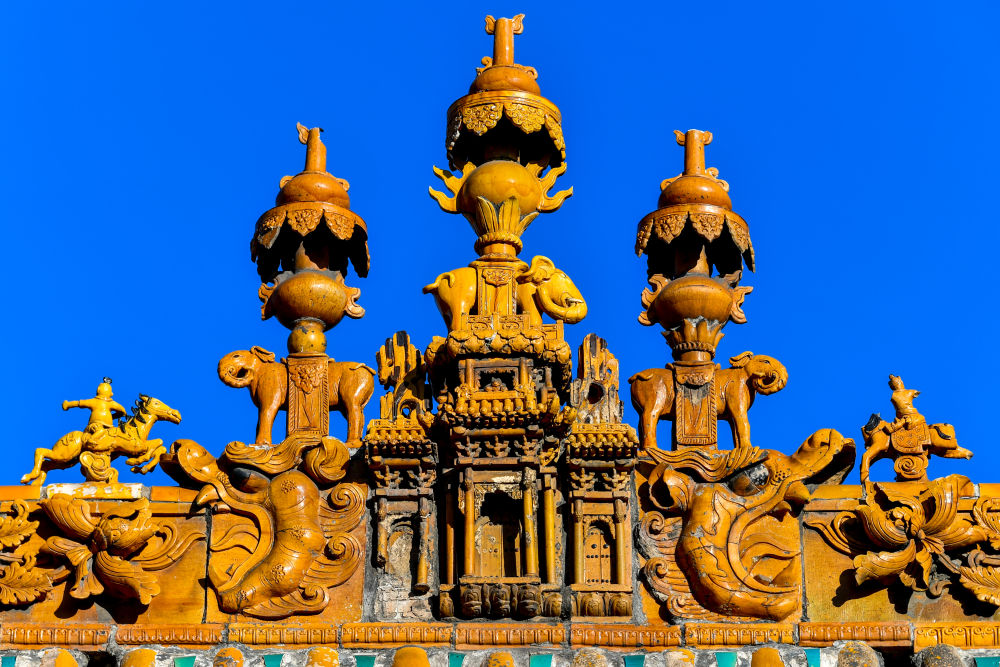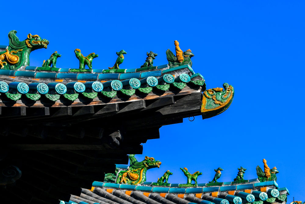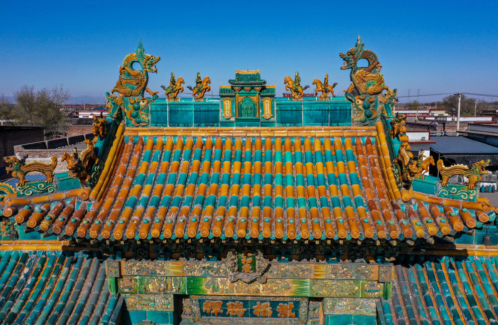 这是11月18日在山西省介休市后土庙拍摄的古建顶上的装饰构件。孔雀蓝、翡翠绿、琥珀黄……