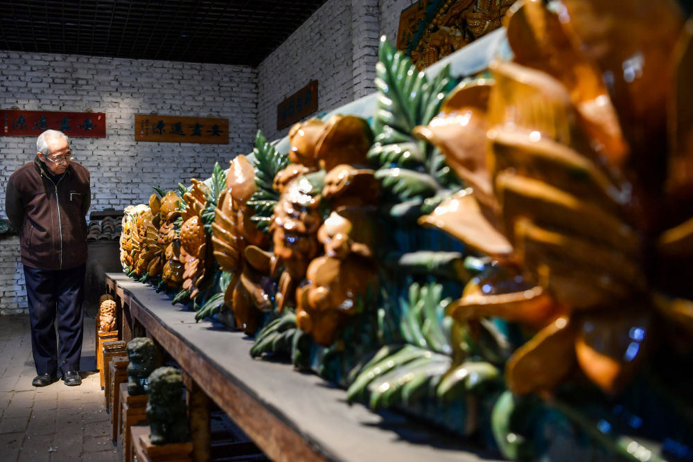 琉璃烧制技艺国家级非遗代表性传承人葛原生在位于山西省太原市的工作室里制作琉璃工艺品。记者:曹阳