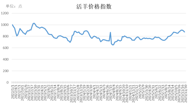 12月1日,怀仁活羊价格指数报876.97点,较上期下跌2.18%,价格报12.59元/斤,较上期下跌0.28元/斤。