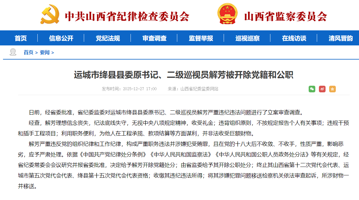 日前,经省委批准,省纪委监委对运城市绛县县委原书记、二级巡视员解芳严重违纪违法问题进行了立案审查调查。
