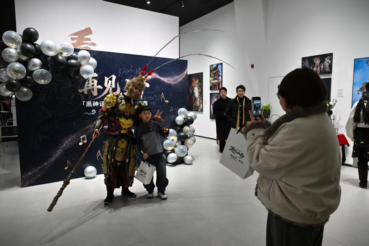 12月31日,在「黑神话:悟空」遇见山西——古建数字艺术展上,小朋友与现场coser(角色扮演者)合影留念。新华网发