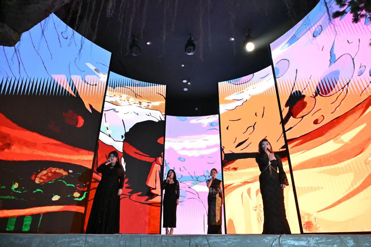 整场演出打破传统舞台界限,演唱者穿梭于古建数字艺术展各展厅之间,观众也跟随其后,在移步换景中体验了一场沉浸式的音乐之旅。《看见》《勿听》《不由己》《未竟》《我也去当个天命人玩玩》等游戏中的经典曲目一一呈现,或激昂或婉转的精彩表演与展馆中的古建场景、数字空间交相辉映,仿佛带观众重返游戏中“天命人”的冒险之路。