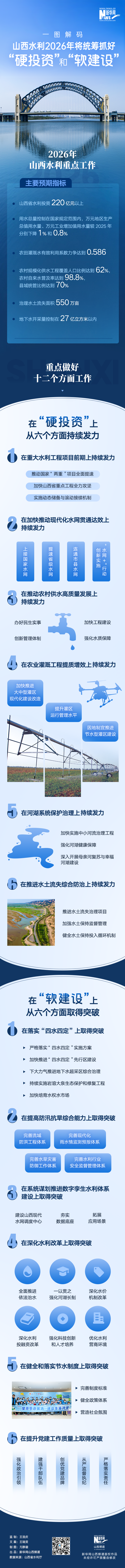 1月22日,2026年山西省水利工作会议在山西省太原市召开。山西省水利厅党组书记、厅长龚孟建在会上提出,2026年,山西省水利部门将统筹抓好“硬投资”和“软建设”,扎实做好全年各项工作,真抓实干见实效,为“十五五”水利工作开好局起好步,奠定坚实基础。