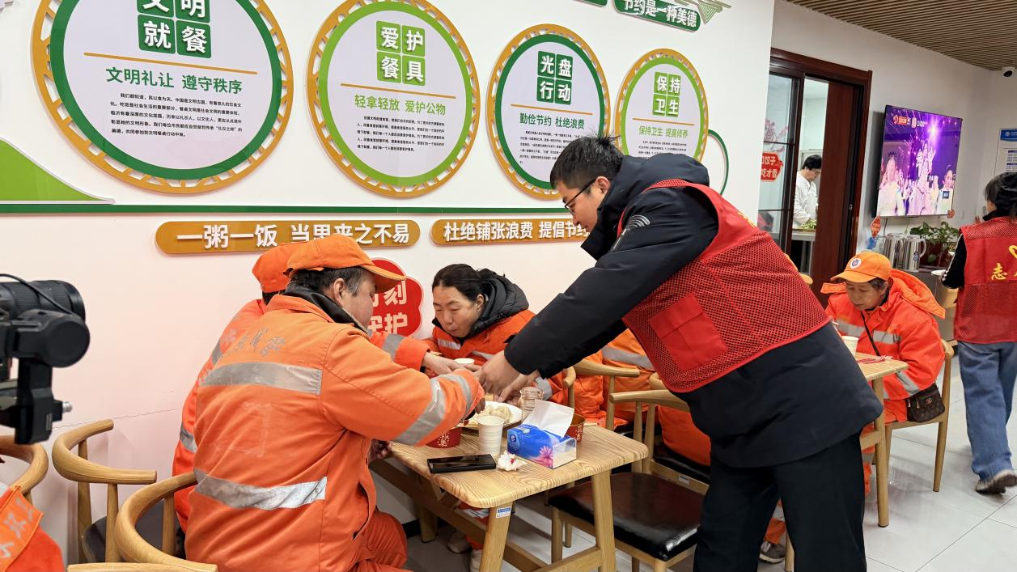 2月11日,山西移动工作人员为环卫工人送饺子。