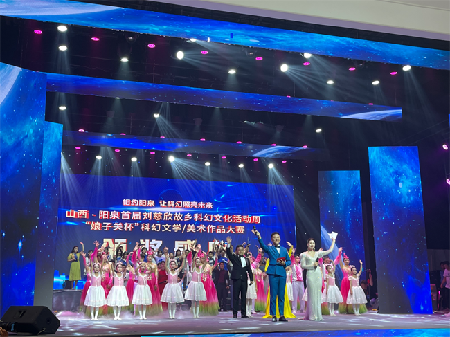 在当日下午举行的“娘子关杯”科幻文学/美术作品大赛颁奖盛典上,刘慈欣出席典礼并为获奖者颁奖。本次颁奖盛典是山西阳泉首届刘慈欣故乡科幻文化活动周内容之一。