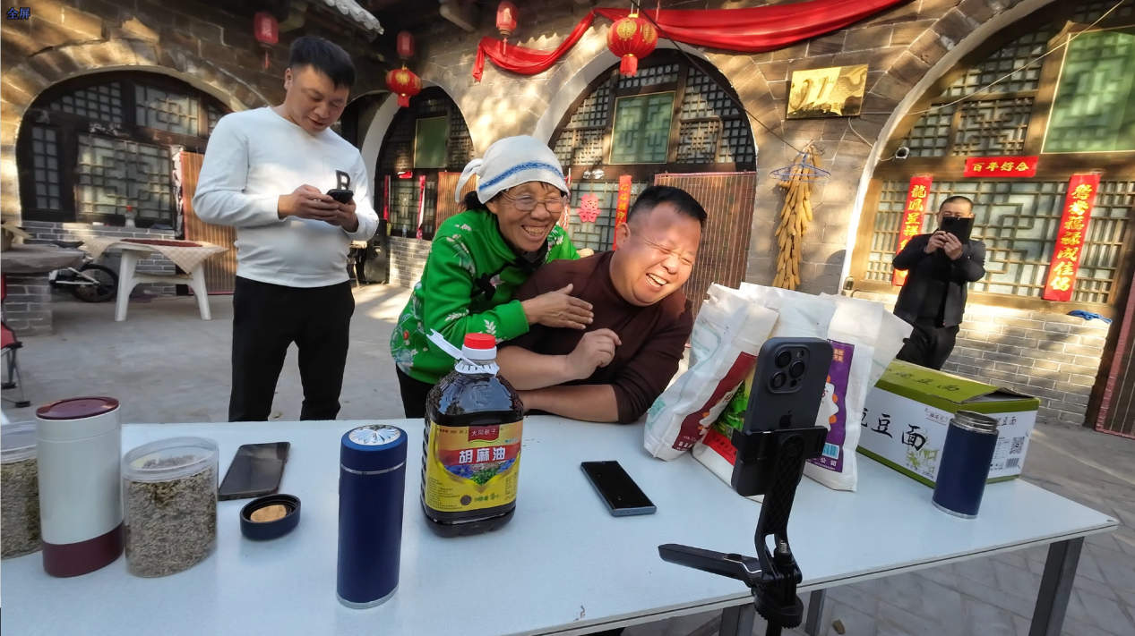 “正宗的胡麻油、地道的粗粮面,有想要的你就拍!”陈玉香的儿子牛牛一边配合老妈与观众互动,一边将农特产品递向镜头,推销着产品。