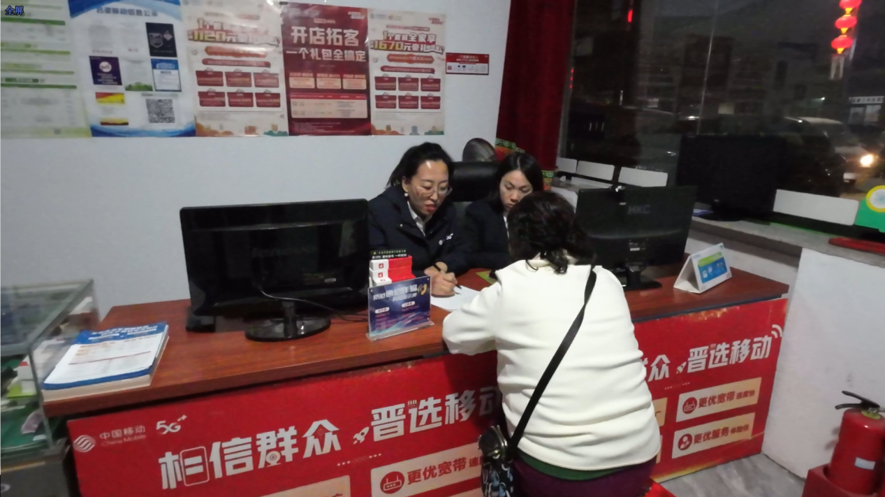 在吕梁移动临县碛口网格点里,一位大妈正在咨询移动通信业务,两名网格员认真为她介绍套餐情况。
