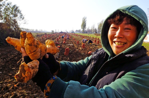 初冬时节,山西省运城市新绛县地黄进入收获季。古交镇北王马村中药材种植户刘会兰承包的70多亩地黄喜获丰收。