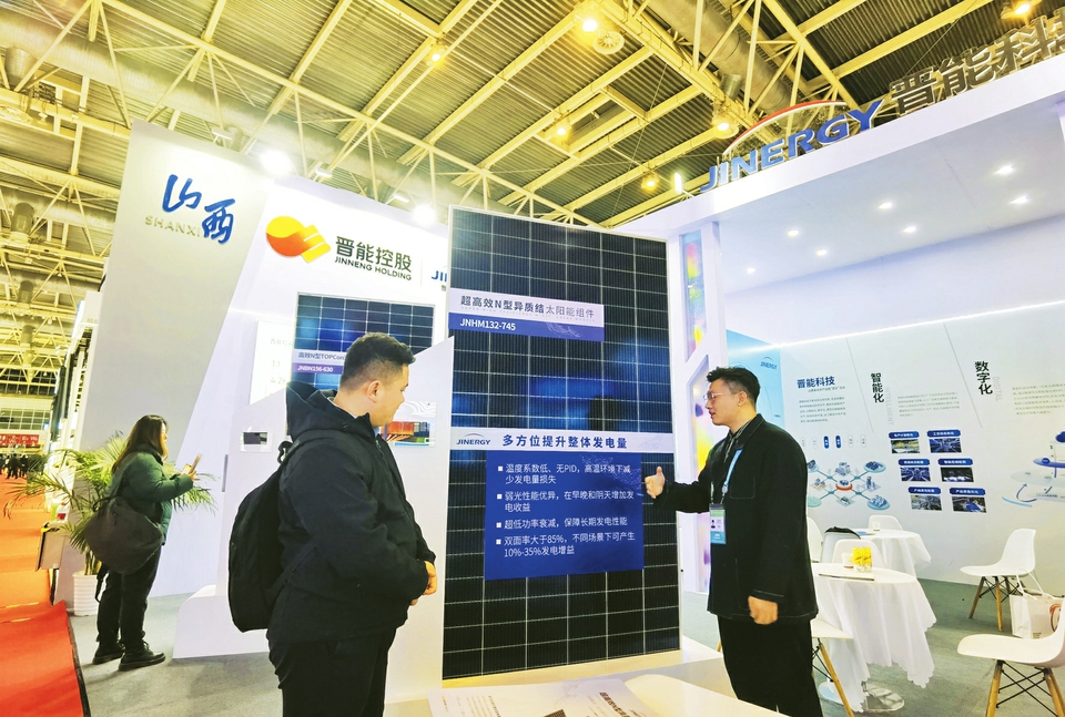 11月28日,在中国国际展览中心顺义馆清洁能源链展厅,晋能清洁能源科技股份公司工作人员正在介绍参展产品。姚毅摄