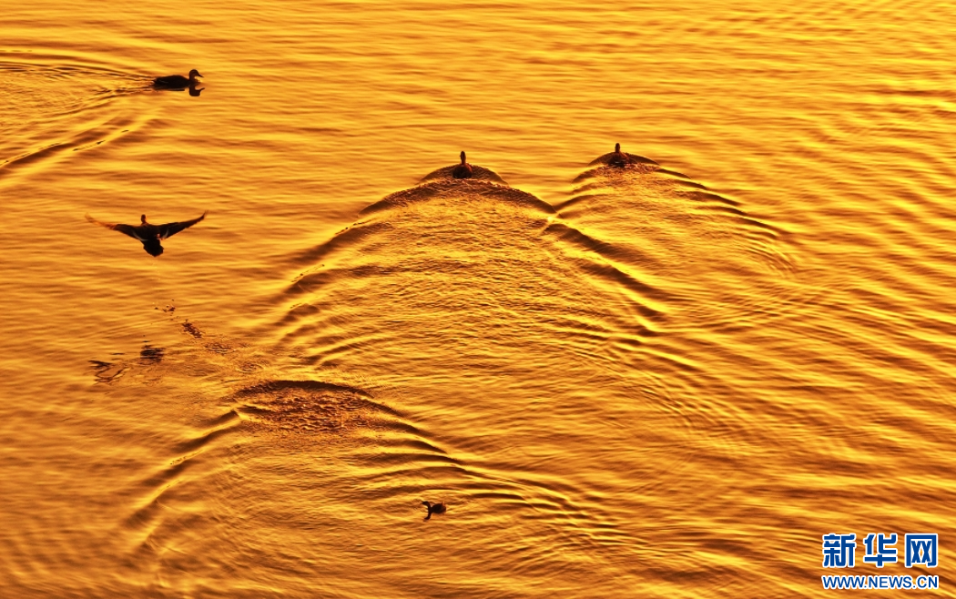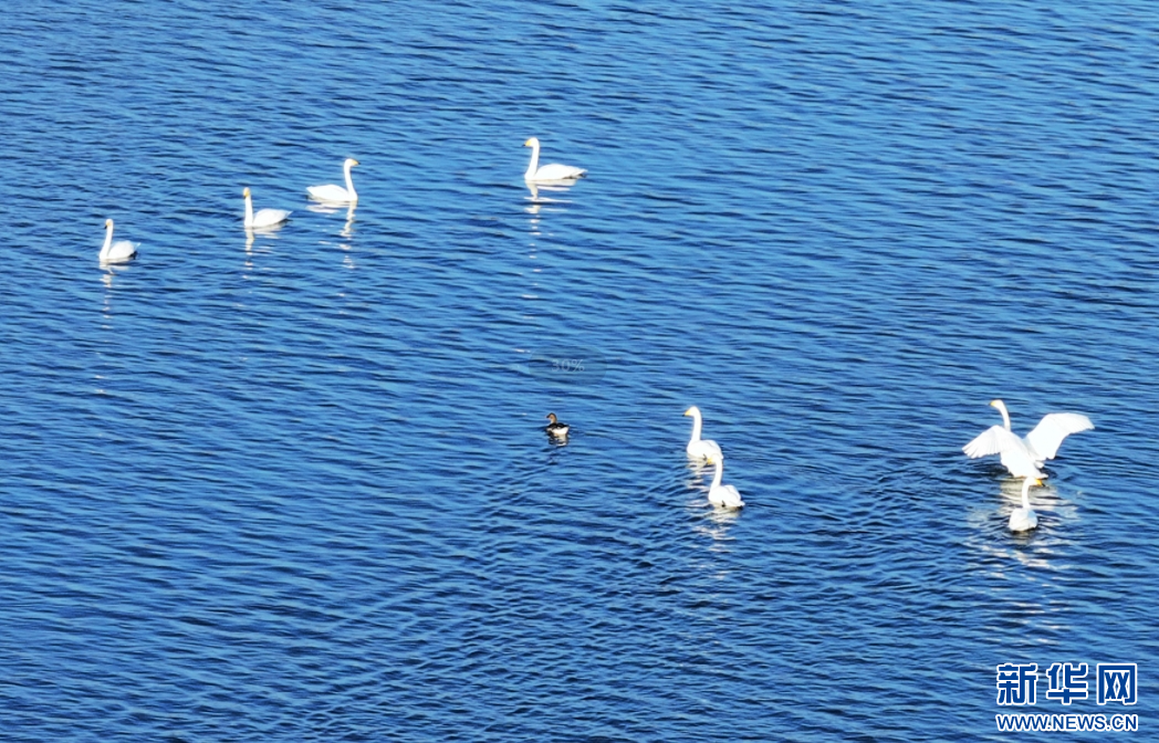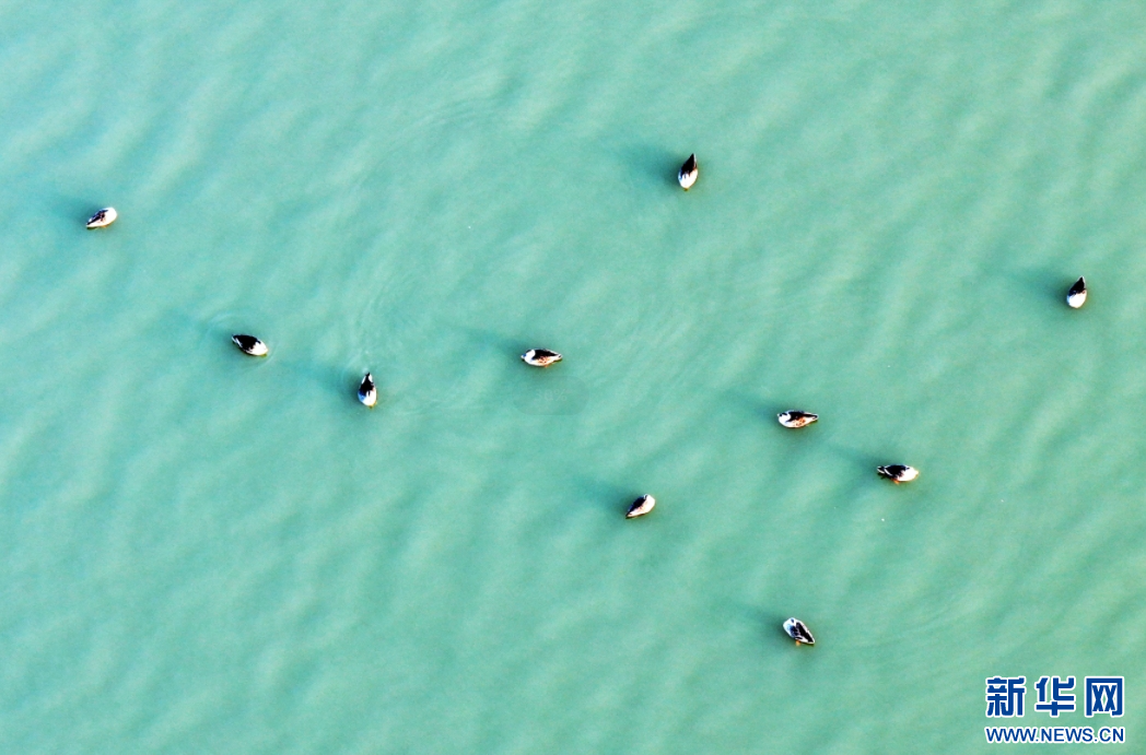 波光粼粼的湖面上,候鸟自在觅食。新华网 发(高新生 摄)