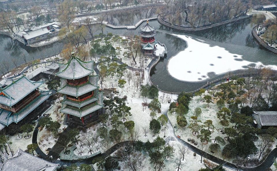 12月10日,纷纷扬扬的雪花将太原迎泽公园装扮成一幅静美的“水墨画”。当日,我省大部分地区迎来雨雪天气。记者李兆民摄