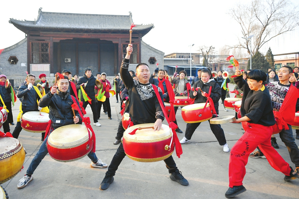 12月29日,在临汾市尧都区金殿镇小榆东村,村民们在积极排练晋南威风锣鼓。新年临近,该村的威风锣鼓又热闹起来,他们创新编排,将传统的锣鼓文化在美丽乡村敲响,喜迎新年的到来。(闫锐鹏摄)