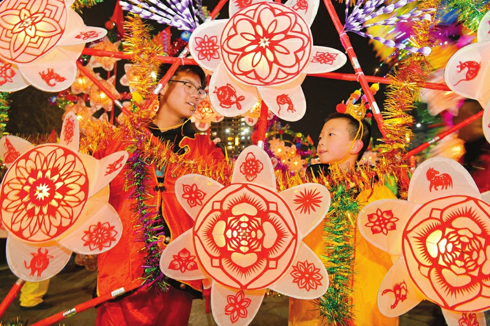 2月22日,河津市李家堡村村民在表演转花灯社火节目。任华杰摄