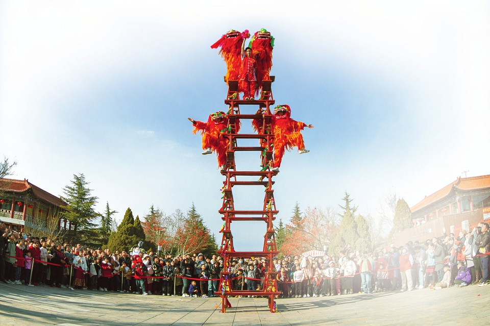2月15日,舞狮队在舜帝陵景区进行“天塔舞狮”表演。新华社发