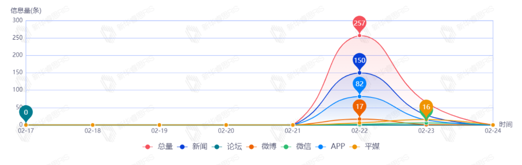 截至目前,该文章在互联网上传播总量共323篇。其中,2月22日是传播的高峰期,共传播257篇文章。各信源的信息发布情况中,新闻信息占比最大,其次是APP和平媒,占比分别为54.69%、30.00%、6.88%。(数据来源:新华睿思·数媒智慧分析平台)