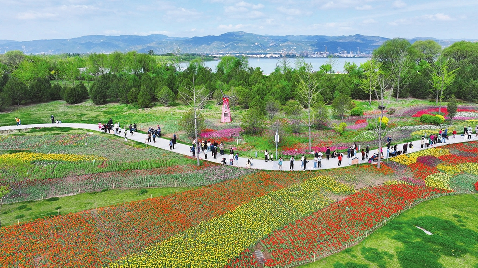 4月20日,太原晋阳湖公园,盛开的多彩郁金香与湖光山色构成一幅美丽春日画卷。近日,太原市第二十届郁金香花展在晋阳湖畔拉开帷幕,近百万株郁金香缤纷盛放、色彩斑斓,人们在色彩纷呈的郁金香“花海”中,感受浪漫的春日美景。