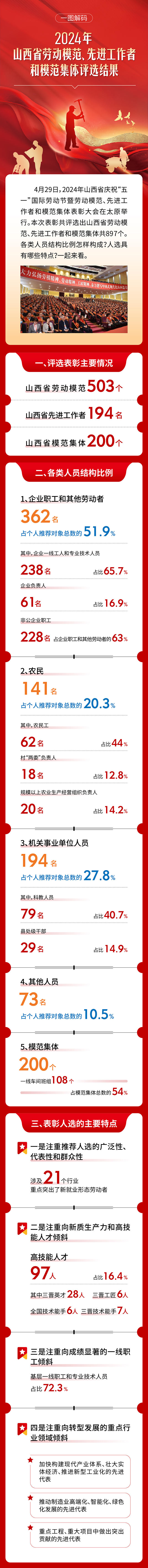 4月29日,2024年山西省庆祝“五一”国际劳动节暨劳动模范、先进工作者和模范集体表彰大会在太原举行。本次表彰共评选出山西省劳动模范、先进工作者和模范集体共897个。各类人员结构比例怎样构成?人选具有哪些特点?一起来看。