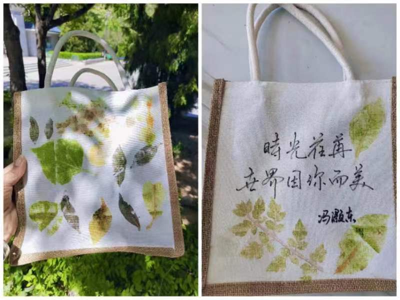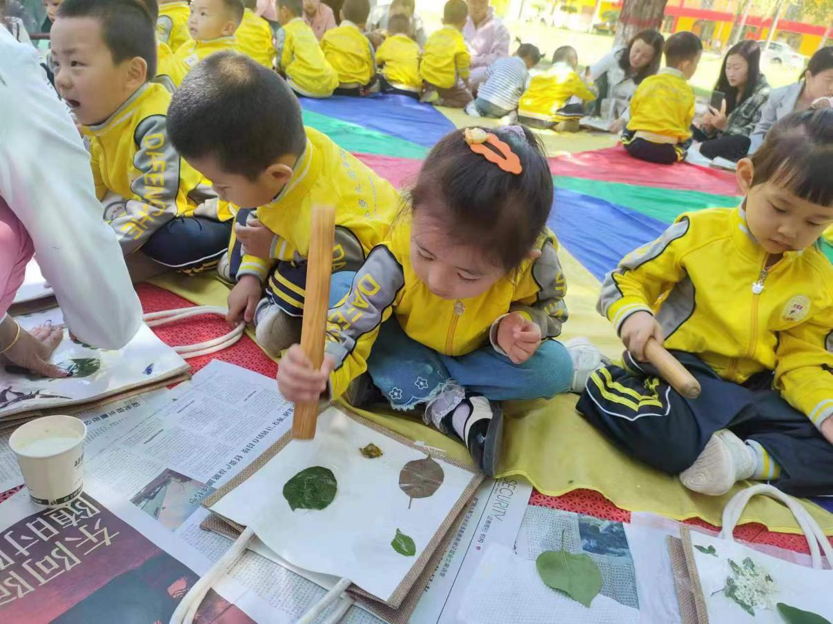活动现场,孩子们在老师的指导下,与家长一起采摘树叶及花朵,用明矾水浸泡植物,为拓印树叶做准备。孩子们通过拓印树叶的方式,在帆布包上创作出属于自己的艺术品,并把做好的帆布包送给妈妈。