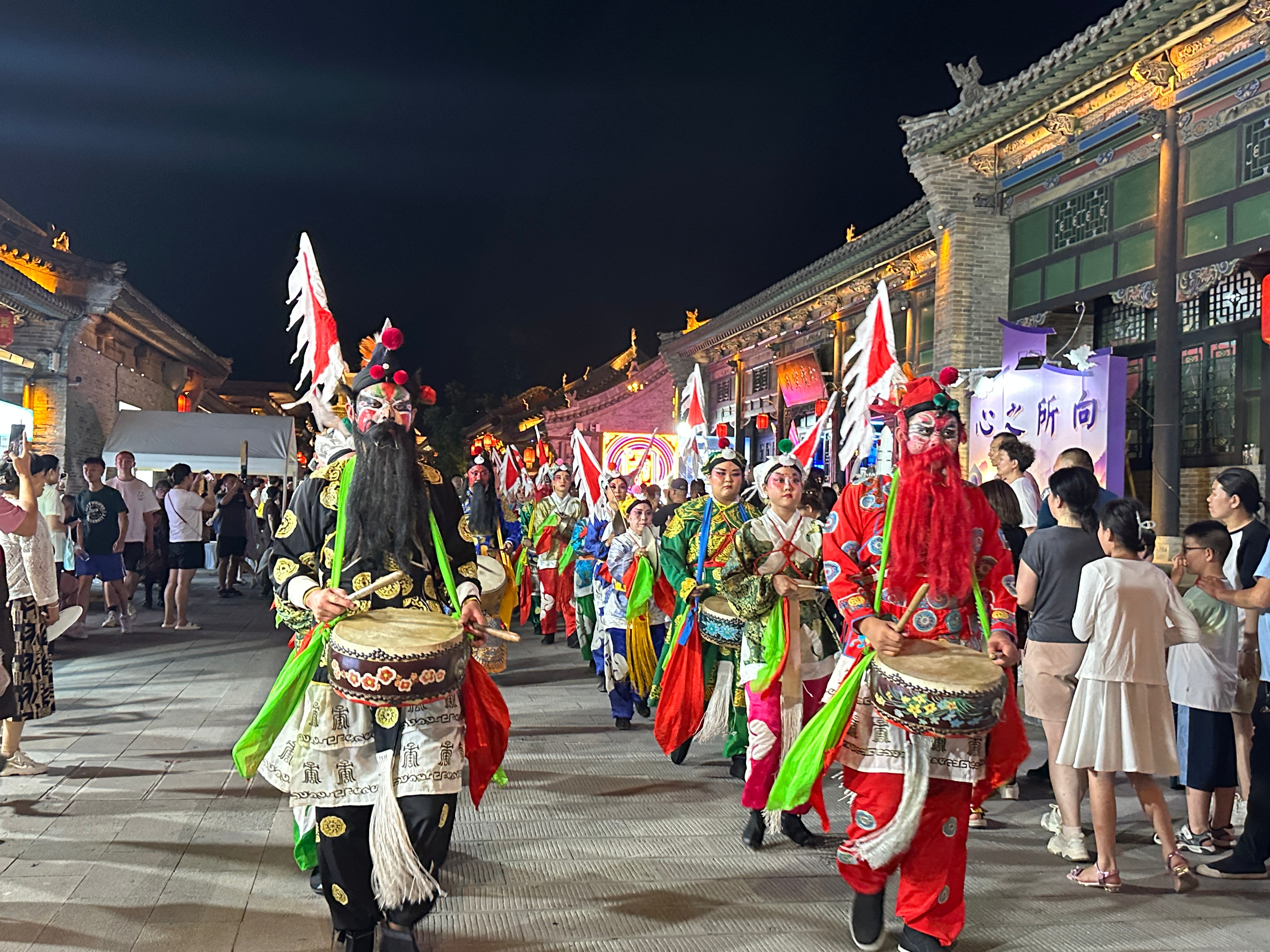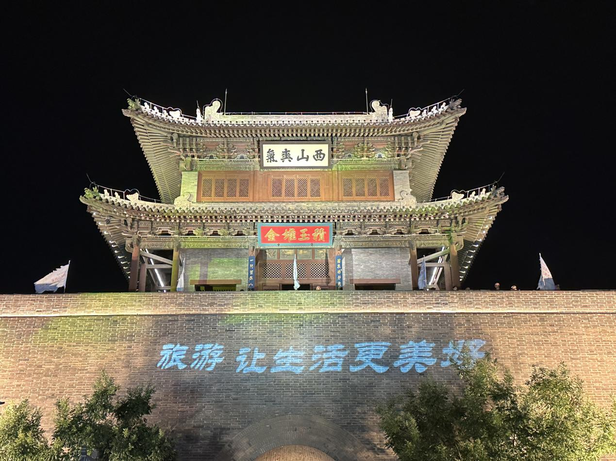 抬头望,太原古县城灯火通明,城墙上闪烁着“旅游 让生活更美好”。