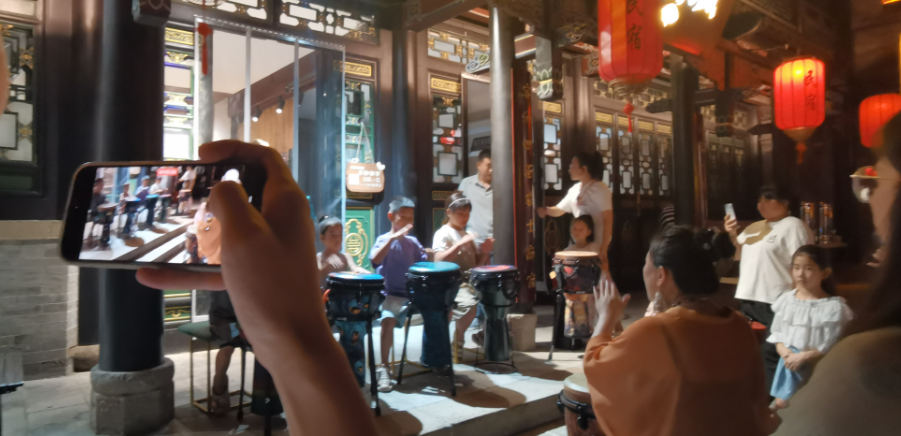 一阵鼓声让行人驻足,一位美女老板对着几个儿童传授打鼓的技巧,墙上贴着“手鼓教学10元/位,5-10分钟学会。”