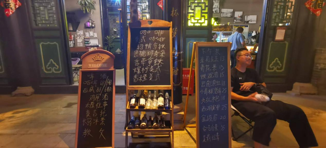 在一家店门口,竖立着三块招牌,分别列出了啤酒、咖啡和茶类,让来逛太原古县城的市民和者游客“各得其所”。