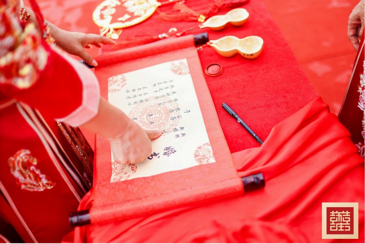 在悠扬的乐声中,新人身着传统礼服,踏上红毯缓缓入场。婚礼依次举行谢拜三礼、共宣结婚誓言、行结发礼、对拜礼、合卺礼等仪式,展现了中国传统婚礼的庄重与神圣。