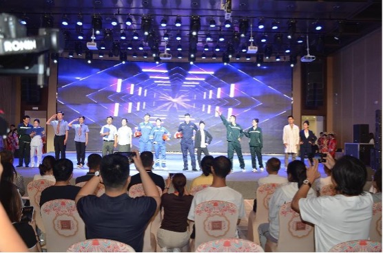 8月9日晚,山西省总工会在喜镇苏庄举行了全省百对优秀职工集体婚礼专场演出。图为来自各行业的新人代表进行工装秀表演。