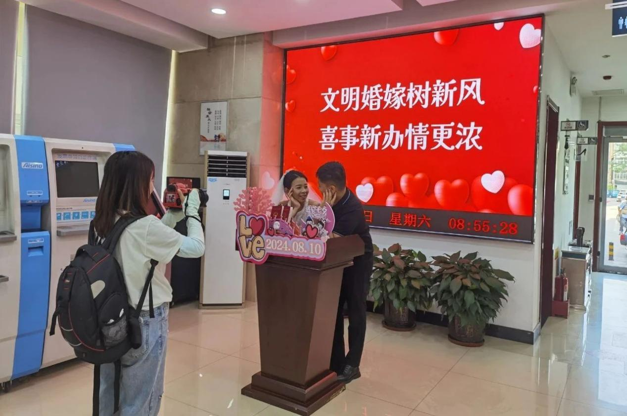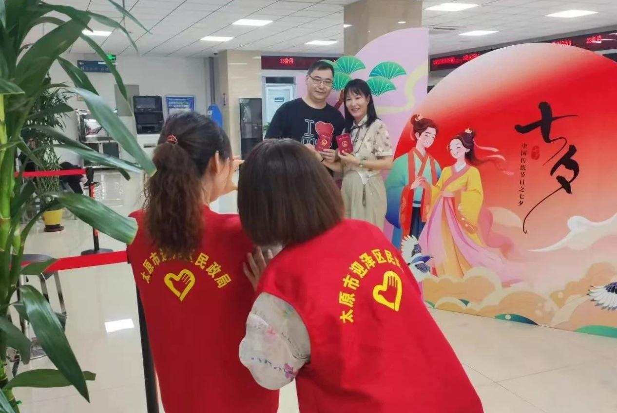 2024年七夕节恰逢周六,不少新人选择在节日当天登记结婚。为满足居民们的“幸福需求”,太原市迎泽区民政局的工作人员加班加点,为前来办理婚姻登记的73对准新人营造了一个温馨喜庆的领证环境。