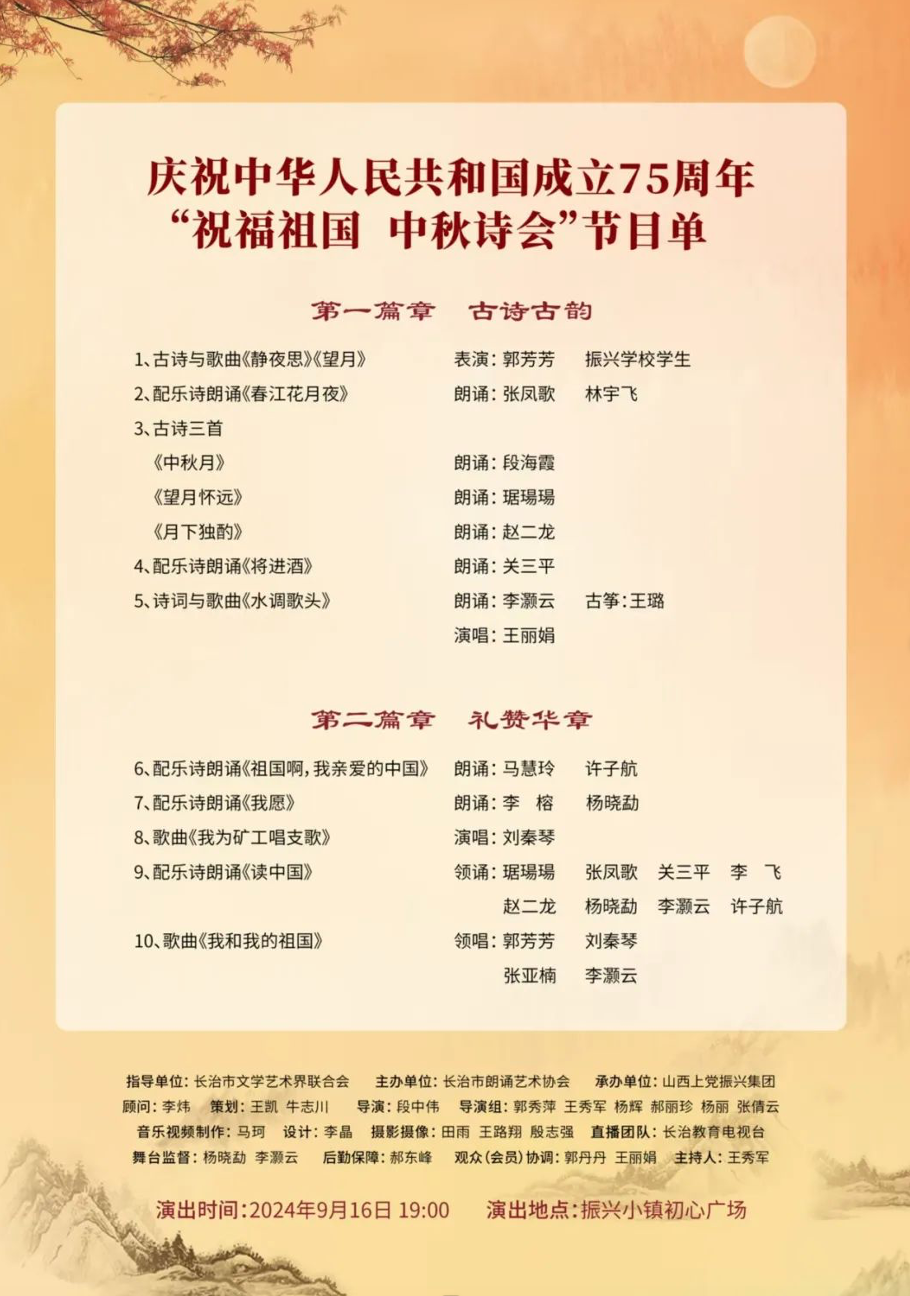 据悉,9月15日晚,长治市杂技团将在振兴小镇初心广场上演精彩的杂技表演;9月16日晚,由长治市文学艺术界联合会指导、长治市朗诵艺术协会主办、山西上党振兴集团承办的庆祝中华人民共和国成立75周年“祝福祖国 中秋诗会”将在初心广场开演;9月17日晚,振兴小镇初心广场将举行振兴村中秋晚会,晚会准备了歌舞、小品、戏曲等一系列精彩节目,将为广大游客和村民献上一场文化大盛宴。