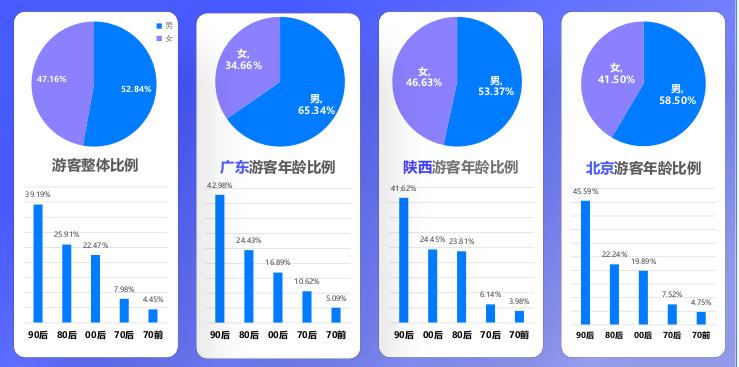 90后是太原旅游市场的主力军,80后、00后紧随其后。由数据可知,赴太原的广东、陕西、北京游客中,90后群体占比第一,陕西游客中00后超越80后占比第二。