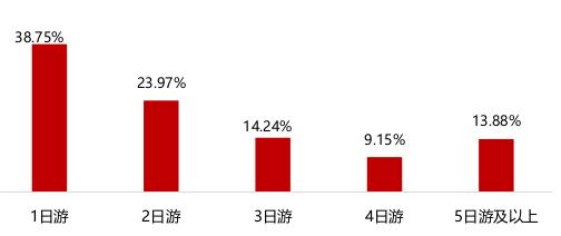 国庆假期,一日游的游客占比最高,达38.75%,其次是2日游(23.97%)、5日游及以上(13.88%)、3日游(14.24%)。整体来看,游客过夜率为 61.37%,较2024年中秋假期(53.32%)明显提升。