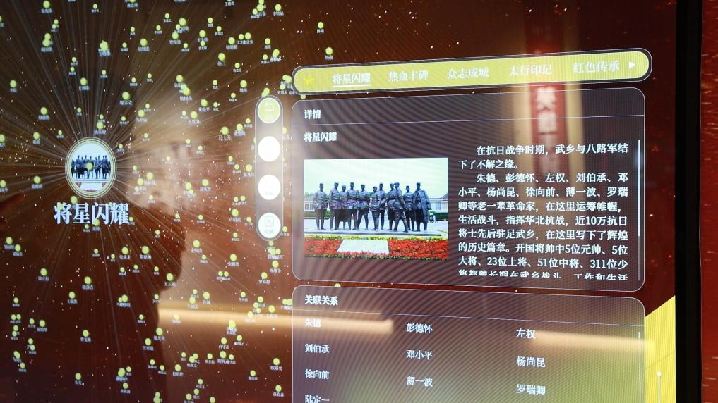 将星云集的大屏就像一片星空,总是吸引观众点击和探索。这一展项汇聚了1300余条来过武乡的将帅及八路军机构的相关故事和文物数据。在这里,只需轻触繁星般的小点,观众就可查看数据、探究战役过程、了解人物关系。
