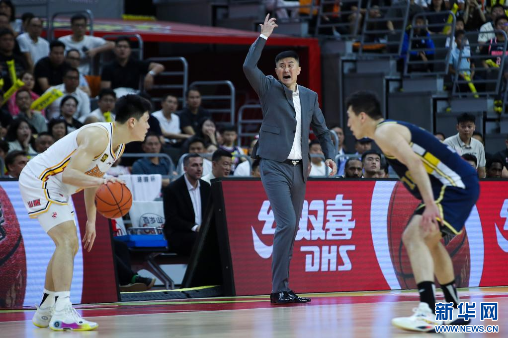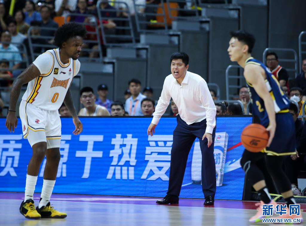 11月1日,山西汾酒队主教练潘江(中)在比赛中指挥。