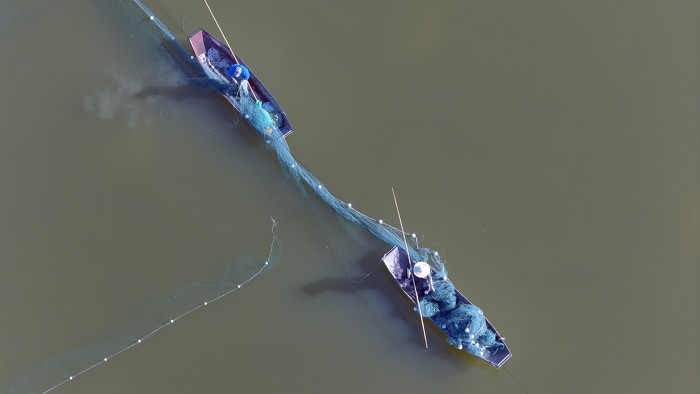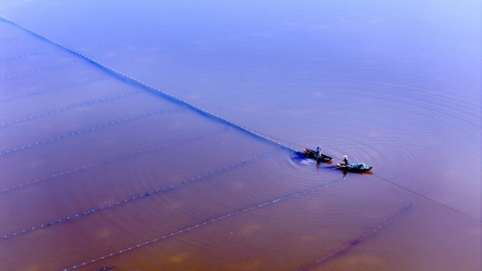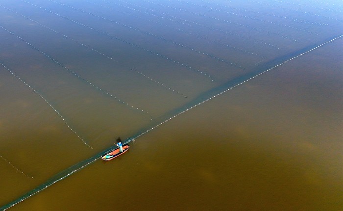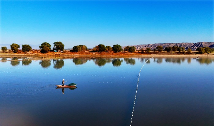11月29日,万荣县汾河滩养鱼专业户渔民们趁着冬日好天气在鱼塘布网劳作。航拍里,一幅美丽的冬日劳作图呈现在画面中,渔民们划着小船在鱼塘里布网劳作,与绿色的水面浑然一体,形成一幅优美的江南风景画。(山西日报客户端图片拍客 张怀心)
