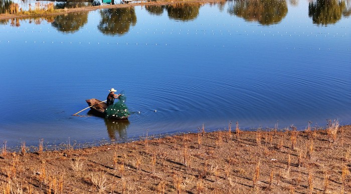 渔民划着小船在鱼塘里布网劳作