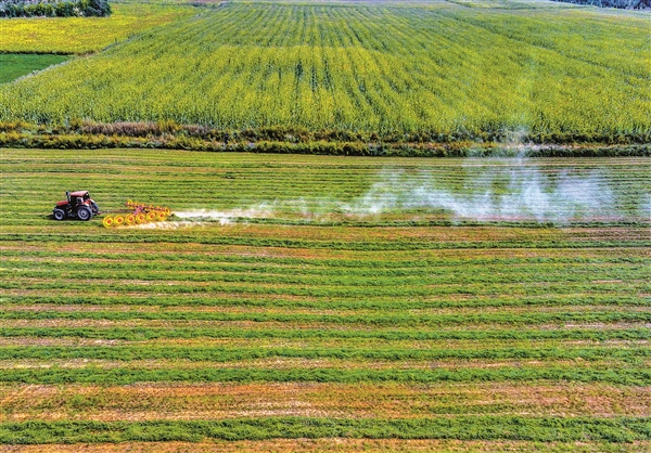 图为山西鑫奥特农业开发有限责任公司采用牧草收割机收割万亩优质紫花苜蓿。记者 程 浩 摄