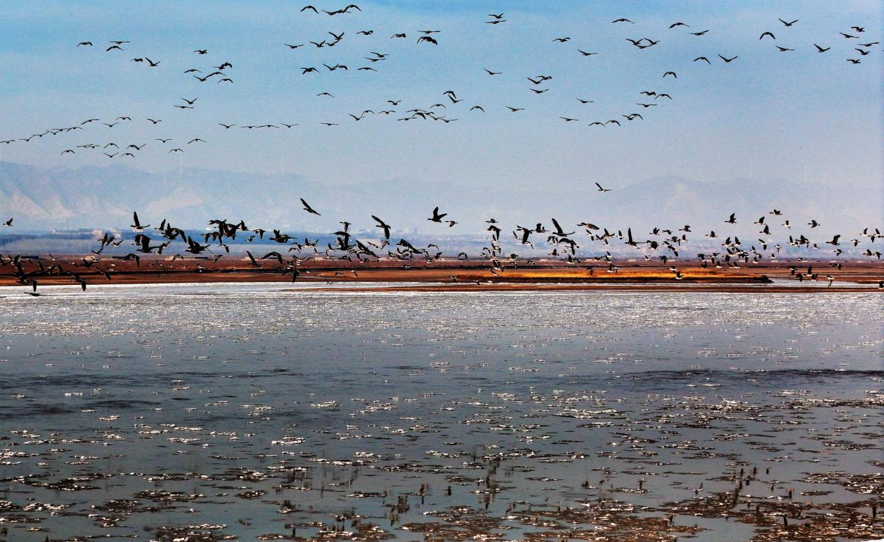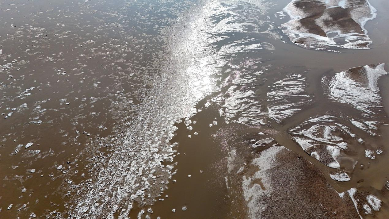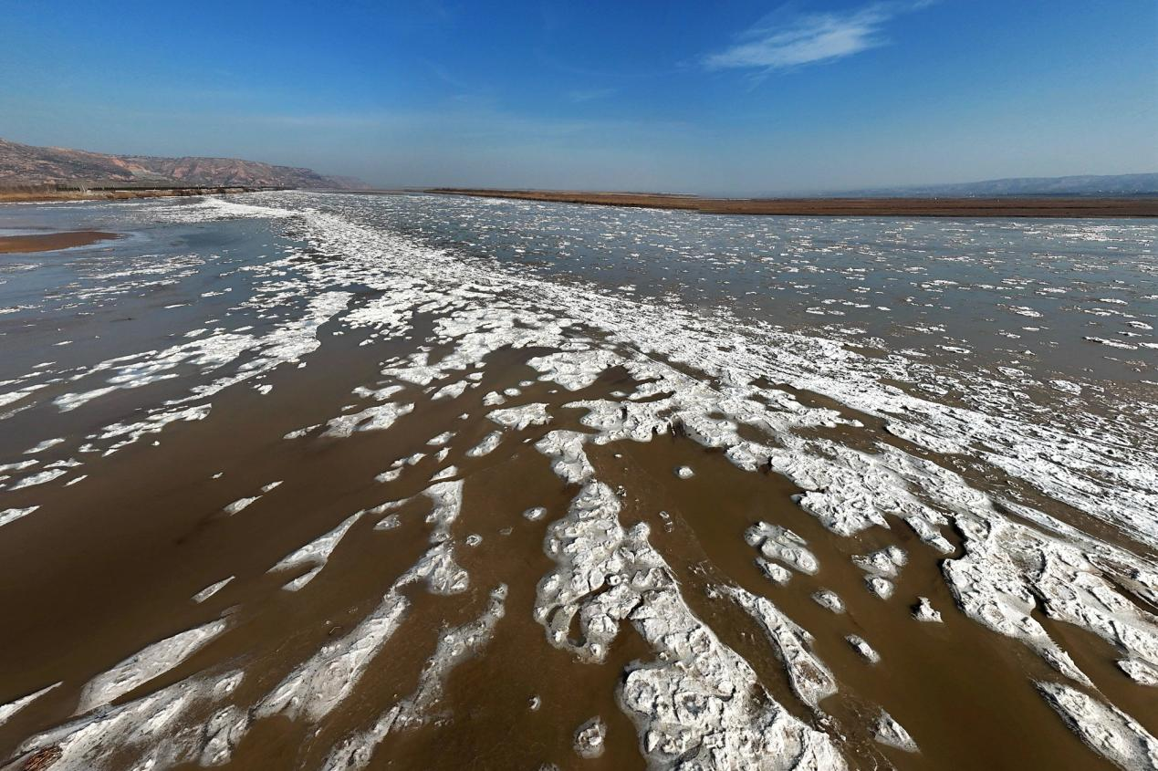 近日,受低温天气影响,黄河万荣段迎来入冬以来首次流凌现象。一朵朵莲花般的冰凌顺着宽阔的河面缓缓流动。群鸟和流凌勾勒出一幅冬日画卷。
