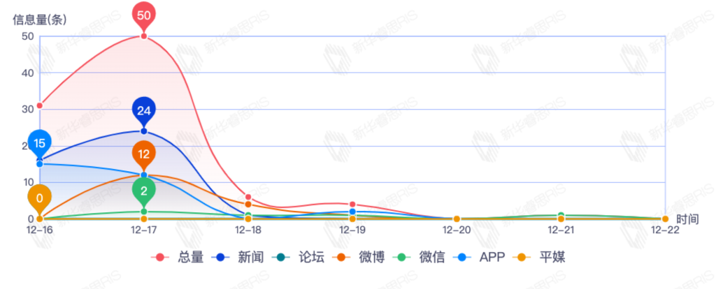 截至目前,该文章在互联网上传播总量492篇。其中12月21日是传播的高峰期,共传播362篇文章。各信源的信息发布情况中,新闻信息占比最大,其次是APP和微信,信息量分别为181、177、73,占比分别为39.09%、38.23%、15.77%。(数据来源:新华睿思数据云图分析平台)