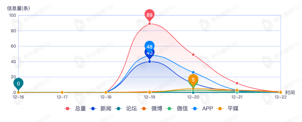 截至目前,该文章在互联网上传播总量151篇。其中12月19日是传播的高峰期,共传播89篇文章。各信源的信息发布情况中,APP信息占比最大,其次是新闻和平媒,信息量分别为58、54、8,占比分别为43.94%、40.91%、6.06%。(数据来源:新华睿思数据云图分析平台)